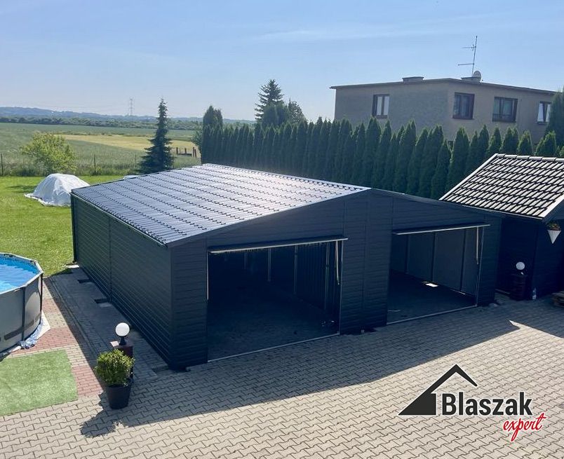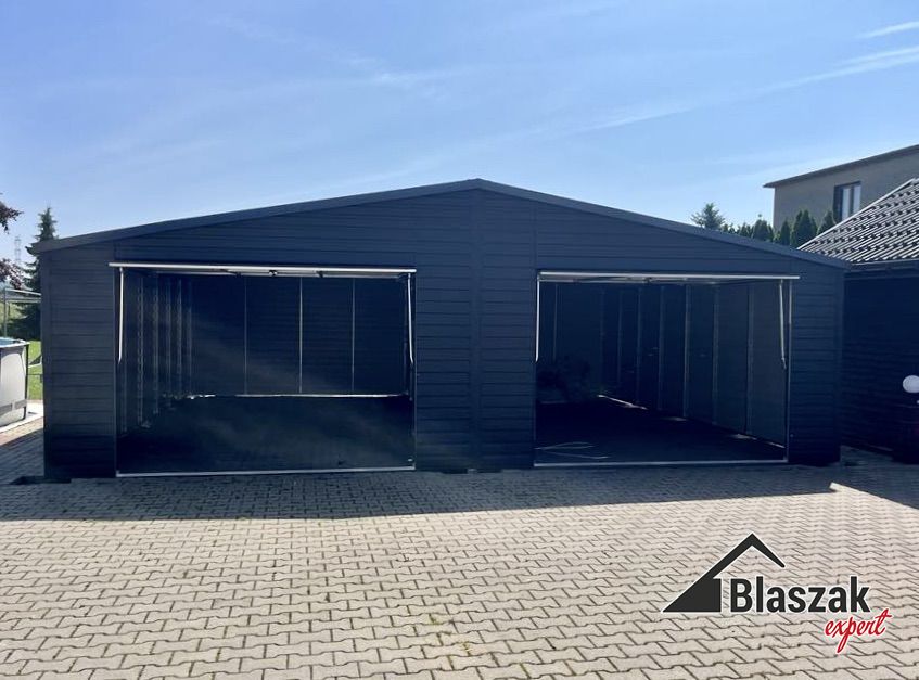 Podwójny garaż akrylowy. Wymiary garażu to 8m szeroki x 7m długi, wewnątrz rozdzielająca ścianka działowa. Spad dachu na boki pokryty blachodachówka kolor RAL7016. Konstrukcja stalowa wykonana w całości z profili zamkniętych ocynkowanych! Wysokość garażu: przód 2,75m, światła wjazdu 1,9m, ściany 2,12m. Bramy uchylne podnoszone do góry ręczne 3m x 2m, po otwarciu wysokość 1.9m. Na ścianach poziomy panel 10cm, bramy uchylne poziomy panel 15cm. Garaż ma okucia narożne i dachowe, a także system rynnowy.